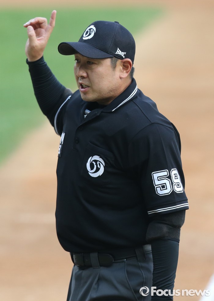 (서울=포커스뉴스) 10일 서울 잠실구장에서 열린 2016프로야구 롯데-두산 경기 2회초 정종수 주심이 롯데 최준석 타석때 두산 투수 보우덴에게 12초룰 경고를 하고 있다.