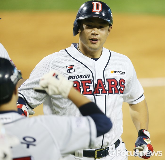 (서울=포커스뉴스) 10일 서울 잠실구장에서 열린 2016프로야구 롯데-두산 경기 6회말 무사 1,2루에서 두산 김재환이 우월 3점 홈런을 치고 밝은 표정으로 홈인하고 있다.
