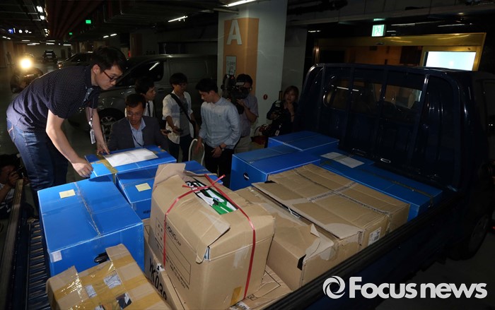 (서울=포커스뉴스) 10일 오후 서울 중구 소공동 롯데호텔에서 검찰 수사관들이 롯데그룹 정책본부 등 계열와 신동빈 롯데그룹 회장 집무실에서 압수수색한 서류를 화물차에 싣고 있다.