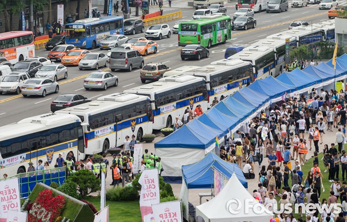 (서울=포커스뉴스) 11일 오후 서울광장에서 열린 제17회 퀴어문화축제 주변이 경찰버스로 통제돼 있다.