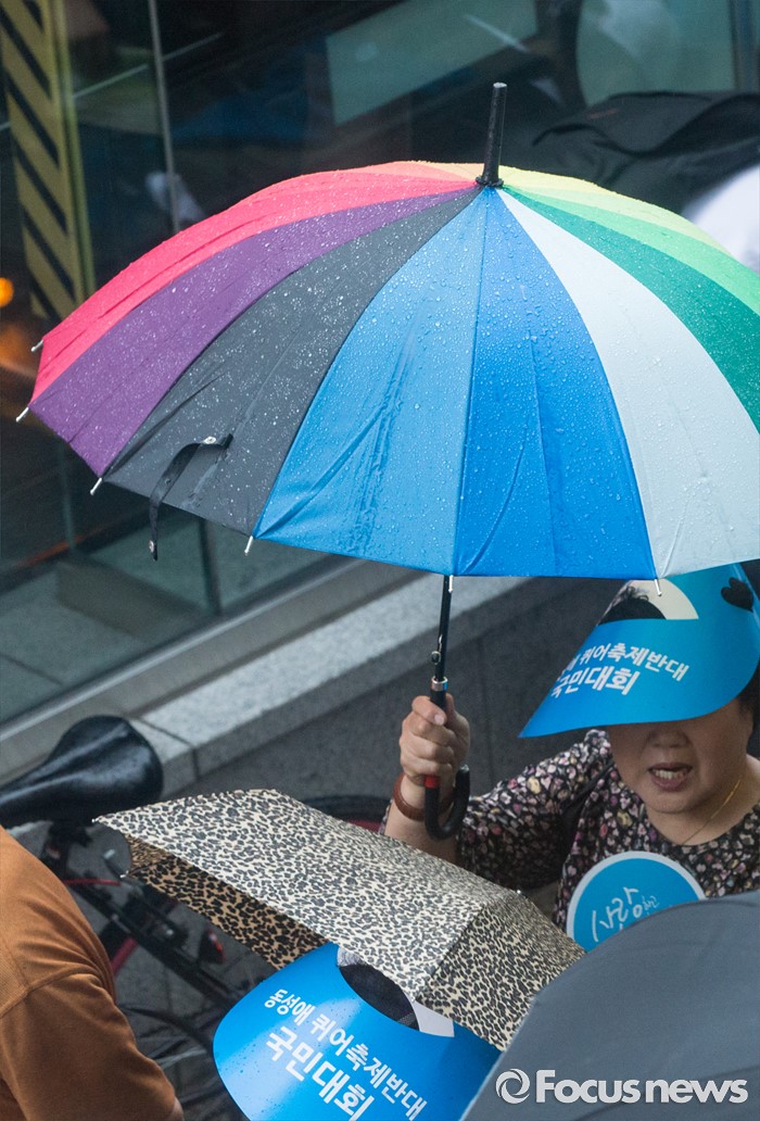 (서울=포커스뉴스) 11일 오후 서울 중구 시청역 인근에서 동성애 퀴어축제를 반대하는 시민이 무지개 우산을 쓰고 지나가고 있다.