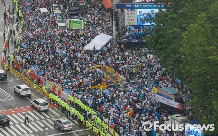 (서울=포커스뉴스) 11일 오후 서울 중구 대한문 앞에서 열린 '2016 서울광장 동성애축제 반대 국민대회'에서 참석자들이 동성애를 반대하는 구호를 외치고 있다.
