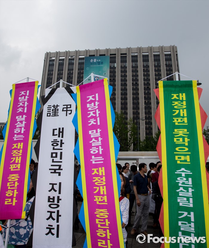(서울=포커스뉴스) 11일 오후 서울 광화문광장에서 열린 지방재정 개악 저지 지방자치 수호 시민문화제에서 참석자들이 지방재정 개편을 규탄하는 손팻말을 들고 있다.