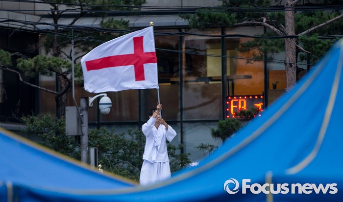 (서울=포커스뉴스) 11일 오후 서울광장 인근에서 한 기독교인이 제17회 퀴어문화축제를 반대하면서 십자가기를 흔들고 있다.
