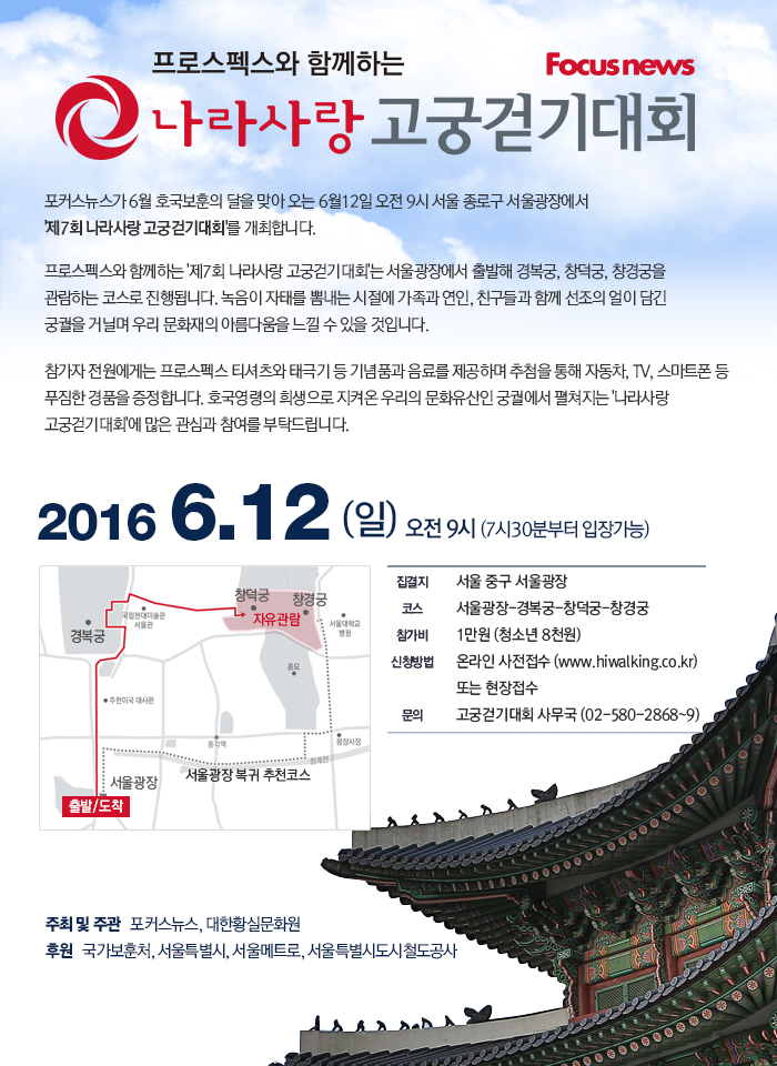 제7회 나라사랑 고궁걷기대회가 <포커스뉴스> 주최로 12일 서울 중구와 종로구에 위치한 고궁 일대에서 열린다. 나라사랑 고궁걷기대회는 호국보훈의 달 6월을 맞아 순국선열과 호국영령의 소중함을 인식하고 생활스포츠 '걷기'를 확대하자는 취지에서 기획됐다.