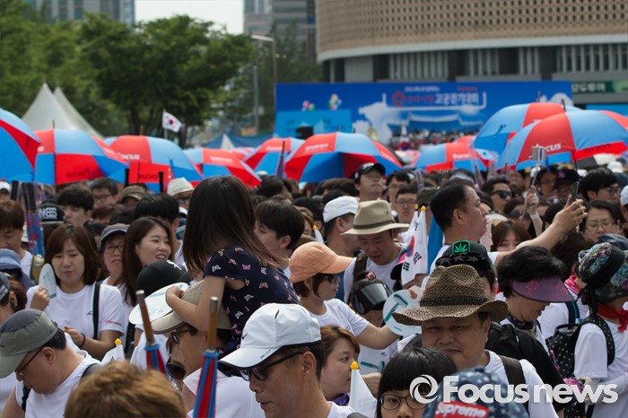 (서울=포커스뉴스) 12일 오전 서울 중구 서울시청 광장에서 열린 '제7회 나라사랑 고궁걷기 대회'에 시민들이 참가하고 있다.