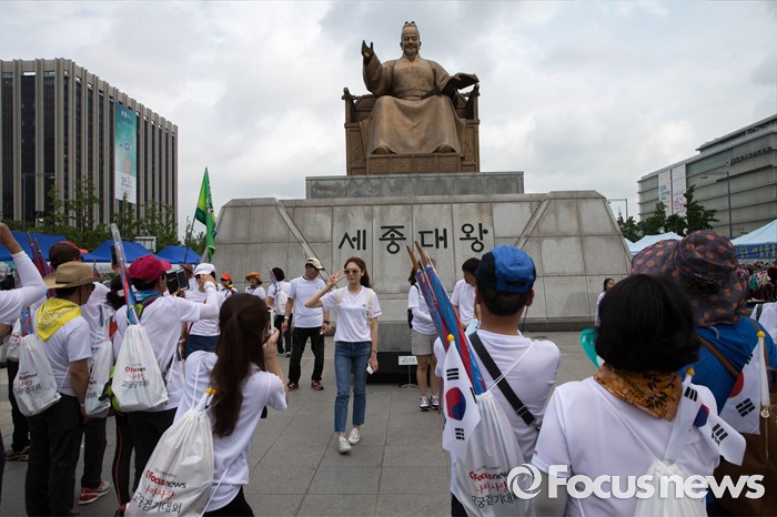 (서울=포커스뉴스) 12일 오전 서울 중구 서울시청 광장에서 열린 '제7회 나라사랑 고궁걷기 대회'에 참가한 시민들이 기념촬영을 하고 있다.