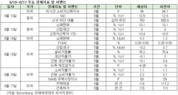 이번주 주목할 이벤트와 경제지표는 △미국 연방공개시장위원회(FOMC) 회의 △중국 5월 산업생산 발표 등이 있다.