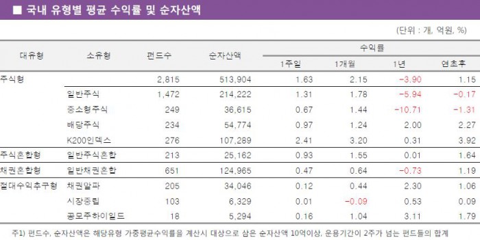 이어 일반주식펀드가 1.31%의 수익률을 기록했고, 배당주식펀드와 중소형주식펀드도 각각 0.97%, 0.67% 상승한 것으로 나타났다. 주식혼합형과 채권혼합형펀드는 각각 0.93%, 0.47%씩 상승했다.
