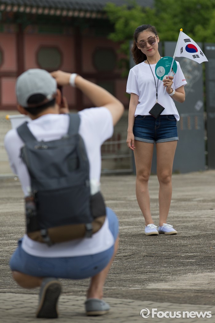 (서울=포커스뉴스) 12일 오전 서울 중구 서울시청 광장에서 열린 제 7회 나라사랑 고궁걷기 대회에 참가한 시민들이 경복궁 내에서 기념촬영을 하고 있다.