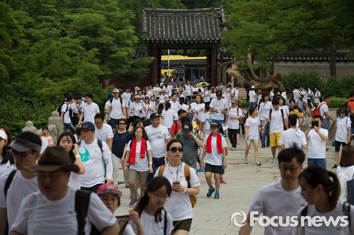 (서울=포커스뉴스) 12일 오전 서울 종로구 창덕궁에서 '제7회 나라사랑 고궁걷기 대회'에 참가한 시민들이 고궁을 둘러보며 걷고 있다.
