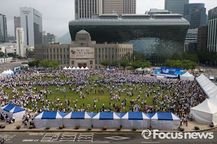 서울광장에 1만2000여 참가자들은 시청 앞 인도까지 늘어섰지만 혼잡은 없었다. 기지개를 켜고, 다리를 쭉 펴고, 수영하는 포즈를 취하는 등 몸을 움직이는 준비운동 시간에도 질서는 흐트러지지 않았다.