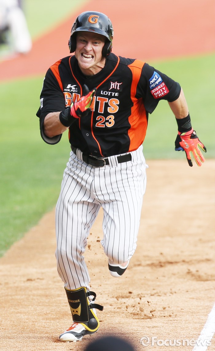 (서울=포커스뉴스) 12일 서울 잠실구장에서 열린 2016 프로야구 롯데-두산 경기 3회초 롯데 선두타자 아두치가 중견수를 넘기는 3루타와 송구 실책을 틈타 홈으로 달리고 있다.