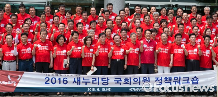 상임위원장 후보자들은 13일 오전까지 계속 의견을 교환할 방침이다. 이같은 조율에도 불구, 만약 교통정리가 이뤄지지 않을 경우 의원총회에서 상임위원장 경선이 치러진다.10일 오전 경기도 과천 국가공무원인재개발원에서 열린 2016 새누리당 정책워크숍에 참석한 김희옥 혁신비대위원장, 정진석 원내대표 등 의원들이 기념촬영을 하고 있다. 2016.06.10 박동욱 기자