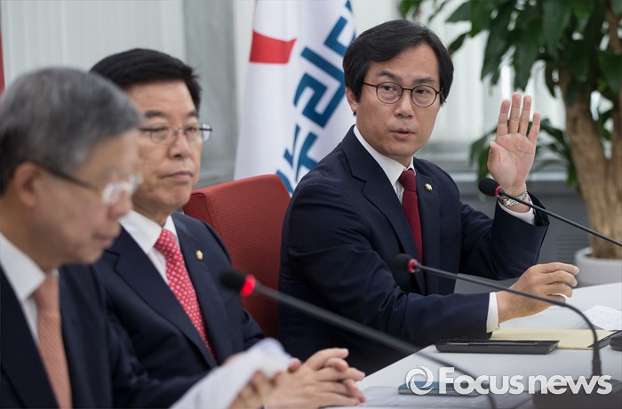 (서울=포커스뉴스) 김영우 국방위원장 내정자 13일 오전 서울 여의도 국회에서 열린 새누리당 혁신비상대책위원회의에 참석해 발언권을 요구하고 있다.