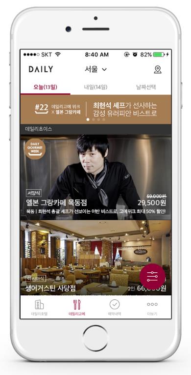(서울=포커스뉴스) 호텔 예약 앱 데일리호텔은 오는 19일까지 스타 셰프 최현석의 레스토랑 '엘본 그랑 카페' 코스요리를 반값에 제공하는 '데일리고메 위크' 프로모션을 실시한다고 13일 밝혔다.