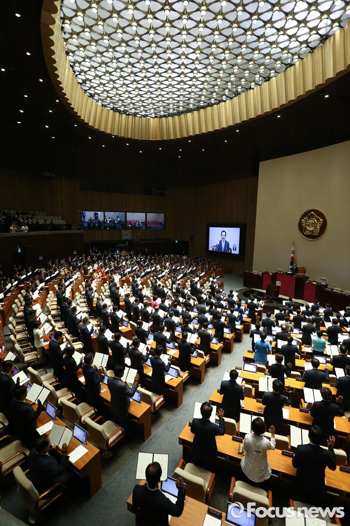(서울=포커스뉴스) 13일 오전 서울 여의도 국회에서 열린 20대 국회 개원식에 참석한 의원들이 선서를 하고 있다.