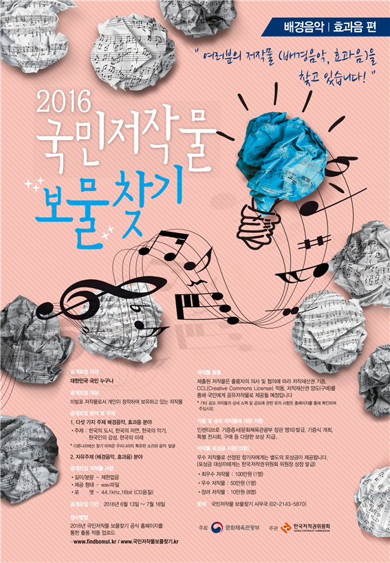 배경음악과 효과음을 창작, 보유하고 있는 대한민국 국민이라면 누구나 이번 공모에 참여할 수 있으며 저작물을 출품할 때는 저작재산권 기증과 저작물 이용 허락(Creative Commons License) 적용, 저작권 양도 중 본인의 의사를 표시해 제출해야 한다.'2016 국민저작물 보물찾기' 포스터.<사진제공=문화체육관광부>