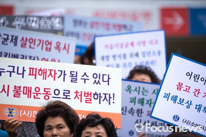 (서울=포커스뉴스) 13일 오전 서울 용산구 롯데마트 서울역점 앞에서 소비자단체 회원들이 롯데마트의 자사 가습기 살균제품 피해에 대한 책임있는 행동을 촉구하고 옥시 제품 판매 중단을 요구하는 집회를 하고 있다.