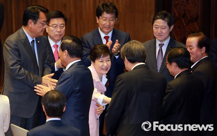 (서울=포커스뉴스) 박근혜 대통령이 13일 오전 서울 여의도 국회에서 열린 20대 국회 개원식에 참석해 연설을 마친 뒤 퇴장하며 김무성 새누리당 전 대표와 인사하고 있다.