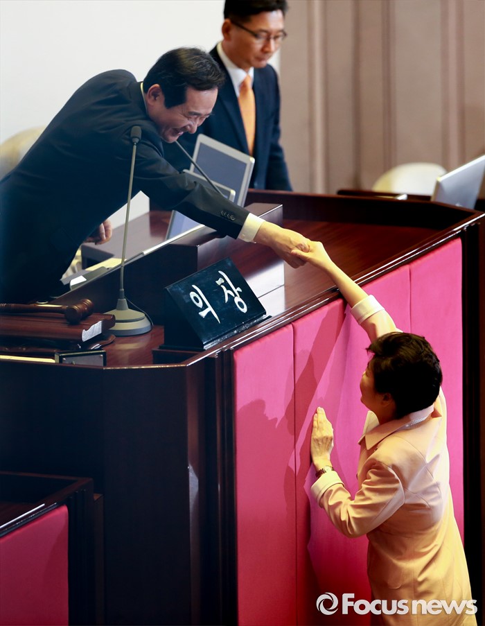 (서울=포커스뉴스) 박근혜 대통령이 13일 오전 서울 여의도 국회에서 열린 20대 국회 개원식에 참석해 연설을 마친 뒤 정세균 국회의장과 인사하고 있다.