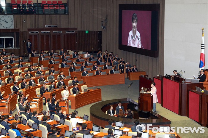 (서울=포커스뉴스) 박근혜 대통령이 13일 오전 서울 여의도 국회에서 열린 20대 국회 개원식에 참석해 연설을 하고 있다.