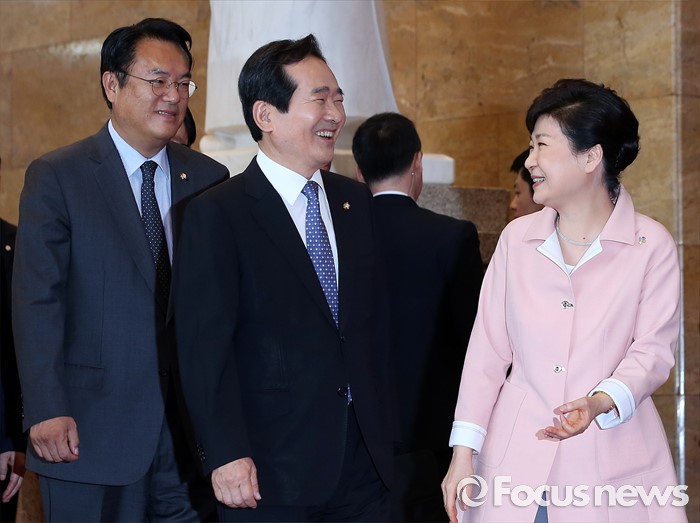(서울=포커스뉴스) 박근혜(오른쪽) 대통령이 13일 오전 서울 여의도 국회에서 열린 20대 국회 개원식에 참석해 여야 지도부 및 5부 요인과 간담회를 가진 뒤 정세균(가운데) 국회의장의 배웅을 받으며 나서고 있다. 왼쪽은 정진석 새누리당 원내대표.