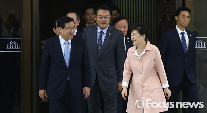 (서울=포커스뉴스) 박근혜 대통령이 13일 오전 서울 여의도 국회에서 열린 20대 국회 개원식에 참석해 연설을 마친 뒤 퇴장하고 있다.