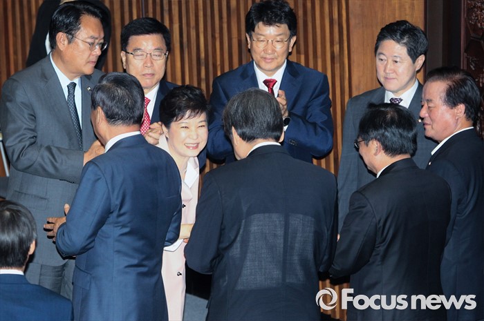 (서울=포커스뉴스) 박근혜 대통령이 13일 오전 서울 여의도 국회에서 열린 20대 국회 개원식에 참석해 연설을 마친 뒤 김무성 새누리당 전 대표 등 의원들과 인사하며 퇴장하고 있다.