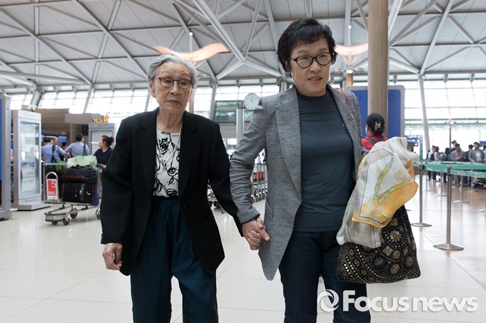 (인천공항=포커스뉴스) 일본군 위안부 피해자인 김복동(왼쪽) 할머니가 유엔 인권이사회에 참석하기 위해 13일 오전 인천국제공항 출국장으로 들어서고 있다.