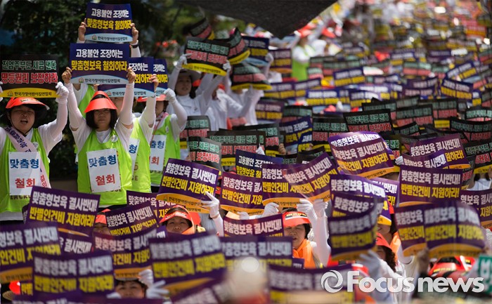 (서울=포커스뉴스) 13일 오후 서울 여의도 KB국민은행 앞에서 한국가정어린이집연합회 회원들이 맞춤형 보육 저지와 누리과정 예산 해결 및 평등지원 촉구 결의대회를 하고 있다.