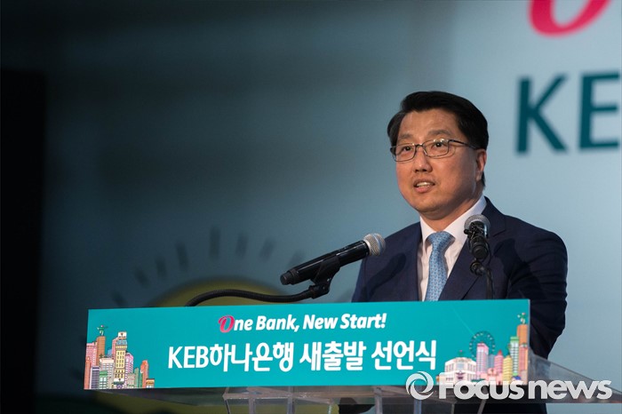 (서울=포커스뉴스) 13일 오후 서울 중구 KEB 하나은행 본점에서 열린 'One Bank, New Start' 선언식에 참석한 진웅섭 금융감독원장이 축사를 하고 있다.