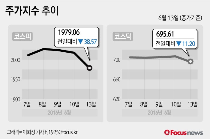 (서울=포커스뉴스) 13일 코스피지수는 전날 보다 1.91%(38.57포인트) 내린 1979.06에 장을 마쳤다. 코스닥지수는 전일 대비 1.58%(11.20포인트) 내린 695.61에 마감했다.