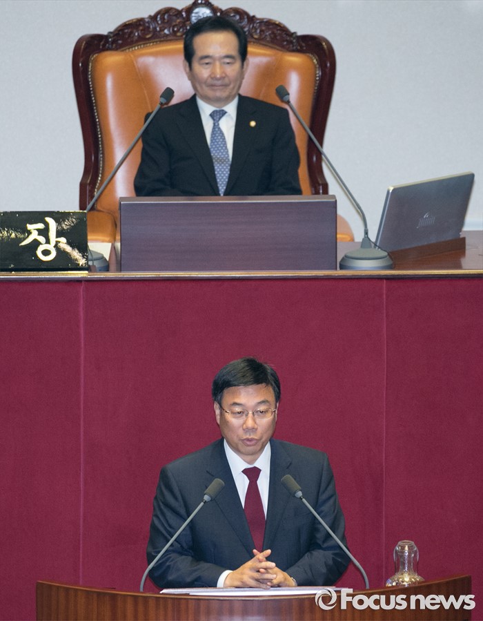(서울=포커스뉴스) 13일 오후 서울 여의도 국회에서 열린 343회 국회(임시회) 2차 본회의에 참석한 신상진 신임 미래창조과학방송통신위원장이 당선 인사를 하고 있다.