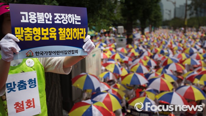 (서울=포커스뉴스) 알록달록 오색우산을 든 가정‧민간 어린이집 교사 1만여명이 정부의 '맞춤형 보육 제도'를 규탄하고 나섰다.