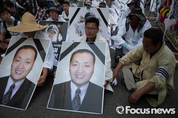(서울=포커스뉴스) 13일 오후 유성기업 노동자 故 한광호씨의 분향소를 양재동 현대차 본사 앞으로 옮기는 꽃길 100리 행진에 참여한 노동자들이 시청 분향소에서 출발해 국회로 행진하던 중 더불어 민주당 당사 앞에 멈춰 집회를 하고 있다.