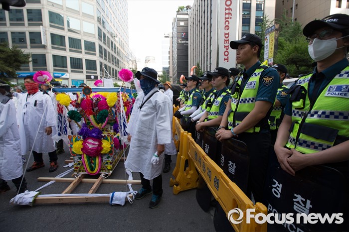 (서울=포커스뉴스) 13일 오후 유성기업 노동자 故 한광호씨의 분향소를 양재동 현대차 본사 앞으로 옮기는 꽃길 100리 행진에 참여한 노동자들이 시청 분향소에서 출발해 국회로 행진하던 중 더불어 민주당 당사 앞에 멈춰 집회를 하고 있다.
