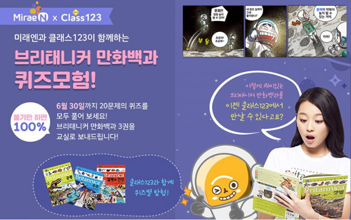 미래엔 아이세움은 이번 퀴즈 서비스 오픈을 기념해 오는 30일까지 '클래스123'에서 1회차 퀴즈 20개를 모두 푼 학급에 '브리태니커 만화 백과' 시리즈 3종을 제공하는 이벤트를 진행한다. 올해 12월까지 매달 새로운 퀴즈 콘텐츠를 선보일 계획이며 자세한 사항은 클래스123 이벤트 페이지에서 확인할 수 있다.미래엔 아이세움은 무료 인터넷 학급 경영 도구 클래스123과 함께 초등학생 대상 '브리태니커 만화 백과' 퀴즈 서비스를 오픈했다.<사진제공=미래엔아이세움>