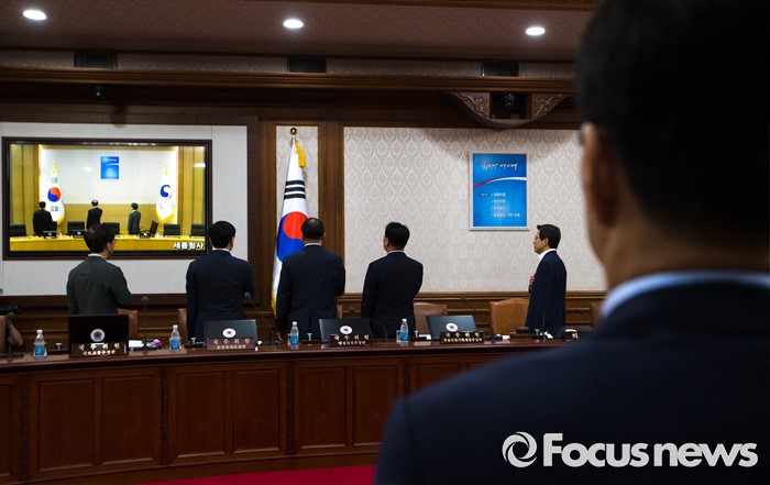 (서울=포커스뉴스) 14일 오전 서울 종로구 정부서울청사에서 열린 국무회의에서 황교안 국무총리와 국무위원들이 국기에 대한 경례를 하고 있다.