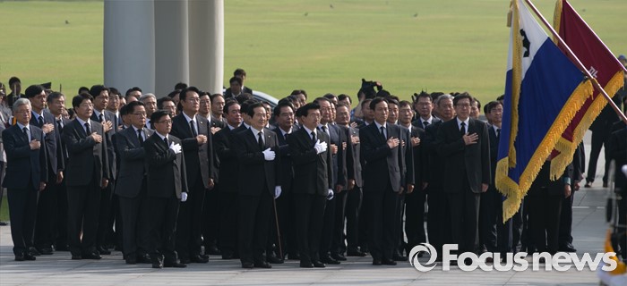 (서울=포커스뉴스) 정세균 국회의장과 정진석 새누리당 원내대표, 우상호 더불어민주당 원내대표, 박지원 국민의당 원내대표, 20대 국회 전반기 상임위원장들이 14일 오전 동작구 국립서울현충원을 방문해 참배를 위해 이동 중 국기에 대한 경례를 하고 있다.