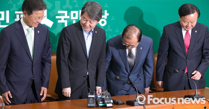 (서울=포커스뉴스) 안철수(왼쪽 두번째) 국민의당 상임공동대표, 천정배(왼쪽 첫번째) 공동대표가 14일 오전 서울 여의도 국회를 방문한 이원종(오른쪽 두번째) 대통령비서실장, 김재원 청와대 정무수석과 인사한 뒤 자리에 앉고 있다.