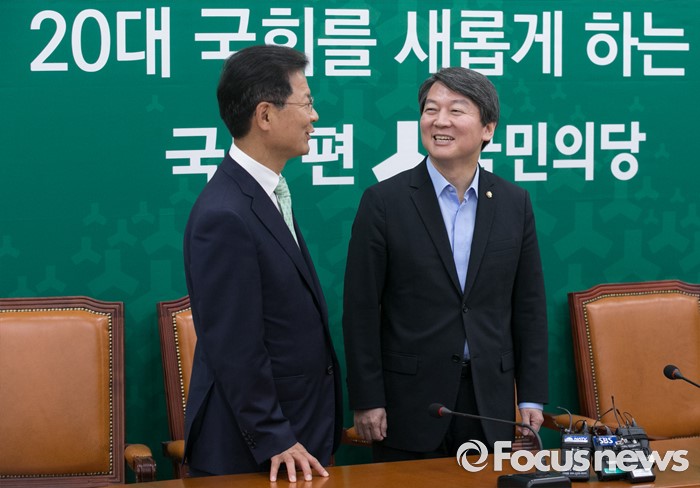 (서울=포커스뉴스) 안철수(오른쪽) 국민의당 상임공동대표와 천정배 공동대표가 14일 오전 서울 여의도 국회에서 이원종 대통령비서실장과 김재원 청와대 정무수석의 방문을 기다리며 대화하고 있다.