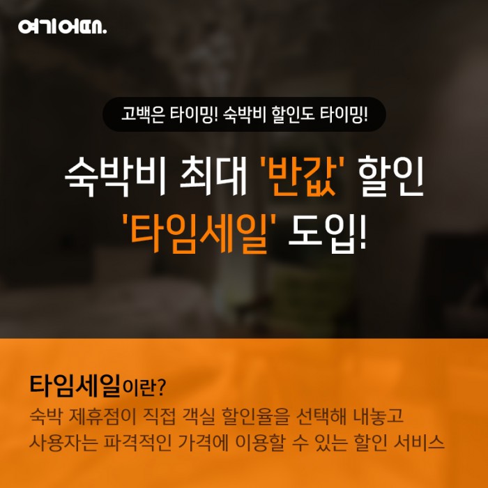 '타임세일'은 숙박 제휴점이 직접 객실 할인율을 선택해 내놓고, 사용자는 파격적인 가격에 이를 이용할 수 있는 서비스다. '타임세일'이 도입된 것은 국내 숙박 O2O 서비스 가운데 여기어때가 처음이다.