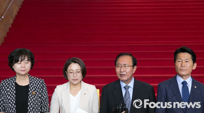 (서울=포커스뉴스) 노회찬 정의당 원내대표와 의원들이 14일 오전 서울 여의도 국회 로텐더홀 계단 앞에서 상임위 배정과 관련 기자회견을 하고 있다. 왼쪽부터 이정미 원내수석부대표, 추혜선 의원, 노 원내대표, 윤소하 의원.