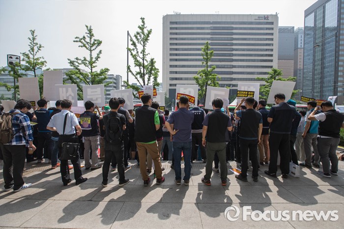 (서울=포커스뉴스) 14일 오전 서울 종로구 세종문화회관 앞에서 양대노총 공공부문공대위가 주최하는 '성과연봉제 중단 촉구 및 공공기관장 워크숍 규탄 기자회견'이 열리고 있다.