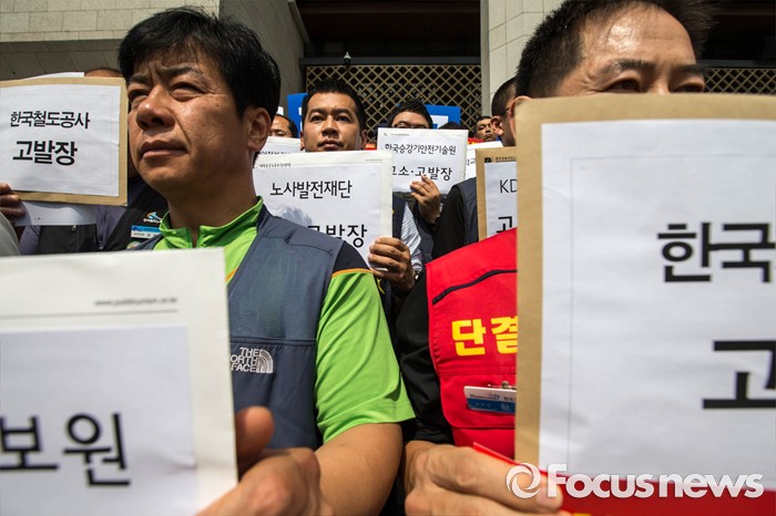 (서울=포커스뉴스) 14일 오전 서울 종로구 세종문화회관 앞에서 양대노총 공공부문공대위가 주최하는 '성과연봉제 중단 촉구 및 공공기관장 워크숍 규탄 기자회견'이 열리고 있다.
