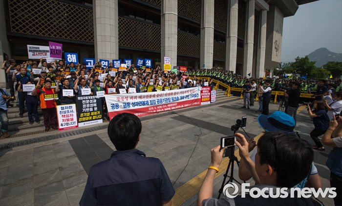 (서울=포커스뉴스) 14일 오전 서울 종로구 세종문화회관 앞에서 양대노총 공공부문공대위가 주최하는 '성과연봉제 중단 촉구 및 공공기관장 워크숍 규탄 기자회견'이 열리고 있다.
