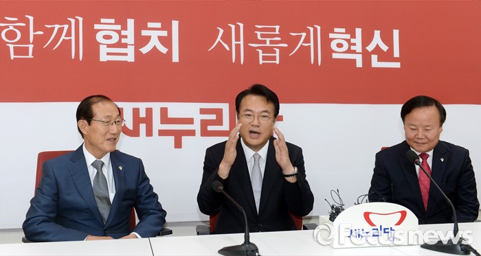 (서울=포커스뉴스) 정진석(가운데) 새누리당 원내대표가 14일 오전 서울 여의도 국회를 방문한 이원종(왼쪽) 대통령비서실장, 김재원 청와대 정무수석과 면담을 하고 있다.