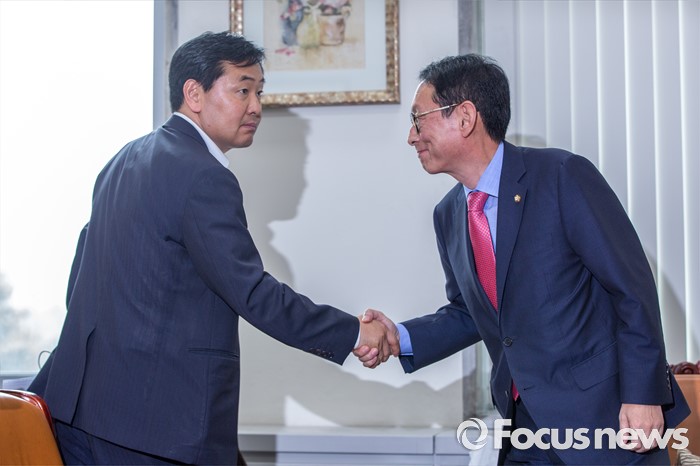 (서울=포커스뉴스) 김도읍(오른쪽) 새누리당 원내수석부대표와 김관영 국민의당 원내수석부대표가 14일 오전 서울 여의도 국회에서 열린 3당 원내수석회동에 앞서 악수 하고 있다.