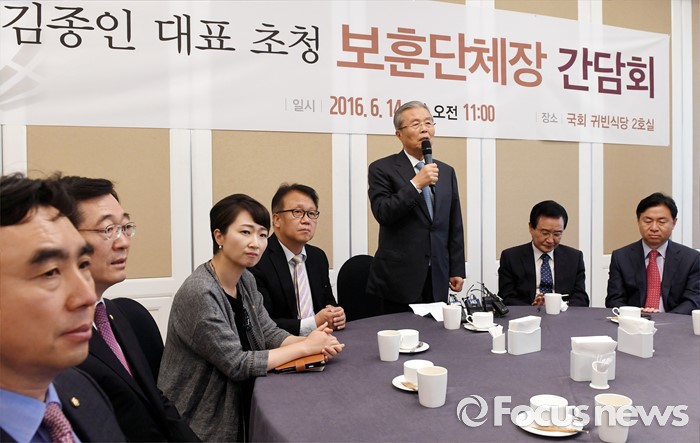 (서울=포커스뉴스) 김종인(오른쪽 세번째) 더불어민주당 비대위 대표가 14일 오전 서울 여의도 국회 귀빈식당에서 열린 보훈단체장과의 간담회에 참석해 인사말을 하고 있다.